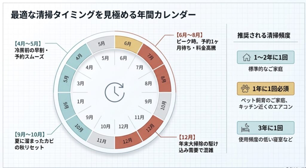 - 9月〜10月(★おすすめ):冷房で溜まったカビを一掃する時期。秋のキャンペーンでお得になる狙い目。