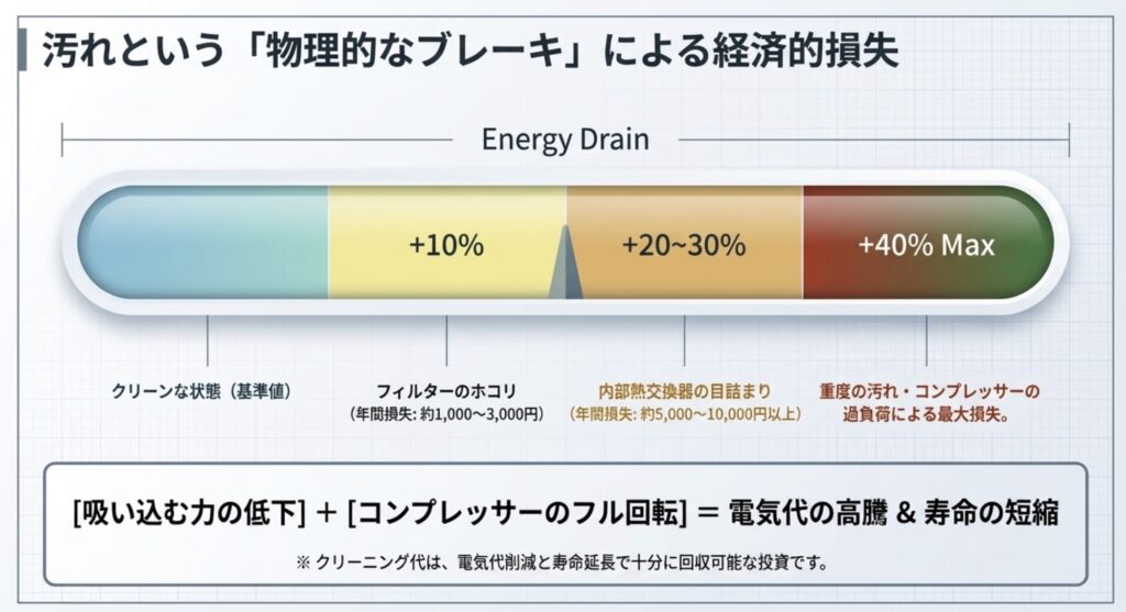 一般的に、フィルターの清掃を怠るだけで消費電力は約10%増加し、さらに内部の熱交換器まで汚れていると、電気代が通常よりも20〜30%、重度の汚れなら最大40%も高くなるという試算もあります。本来ならもっと少ない電力で済むはずなのに、汚れという物理的なブレーキがかかっているせいで、お金をドブに捨てているような状態なんですね。