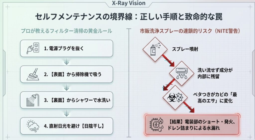 私たちプロの視点から正直にお話しすると、この洗浄スプレーでのセルフ掃除はおすすめできません。むしろ、やらないほうがマシ、と言っても過言ではないほどリスクが高いんです。