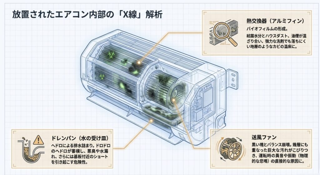 エアコンを長年使い続けていると、中がどうなっているのか見るのが怖くなりますよね。まずは、掃除をせずに放置されたエアコンの内部で何が起きているのか、その実態を見ていきましょう。