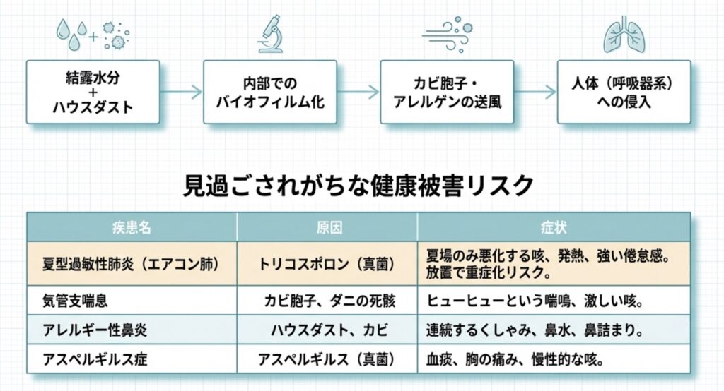 医学的にも特に警戒されているのが、通称「エアコン肺」とも呼ばれる「夏型過敏性肺炎」です。これは「トリコスポロン」という種類のカビを繰り返し吸い込むことで、肺がアレルギー反応を起こし、炎症を起こす病気です。特徴的なのは、エアコンを使う夏場にだけ症状が悪化し、外出したり秋になったりするとケロッと治ってしまう点です。