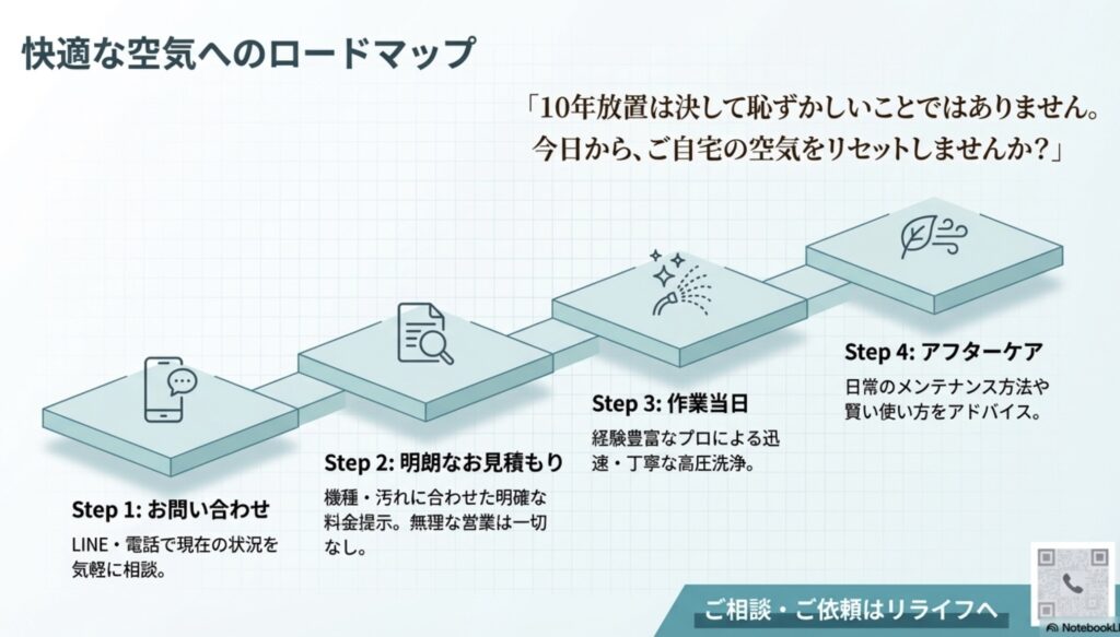 エアコンを掃除したことがないという不安を、安心と快適さに変える。それがリライフのミッションです。私たちは無理な営業も、不明瞭な請求も一切いたしません。まずは小さな疑問からでも構いませんので、お気軽にご相談くださいね。