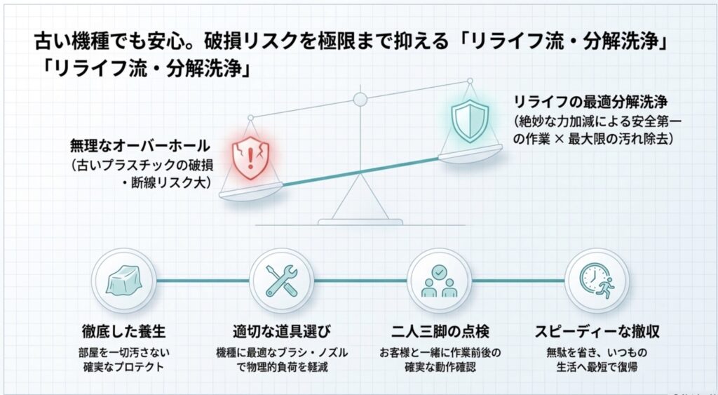 無理に力を入れると、カバーの爪がパキッと折れてしまったり、配線が断線したりすることも……。リライフでは、そうしたリスクを最小限に抑えるため、**「安全第一の分解洗浄」**を徹底しています。無理に全ての部品をバラバラにする「オーバーホール(背抜き分解など)」は、確かに究極の清掃ですが、古い機種では破損リスクがあまりに高すぎます。