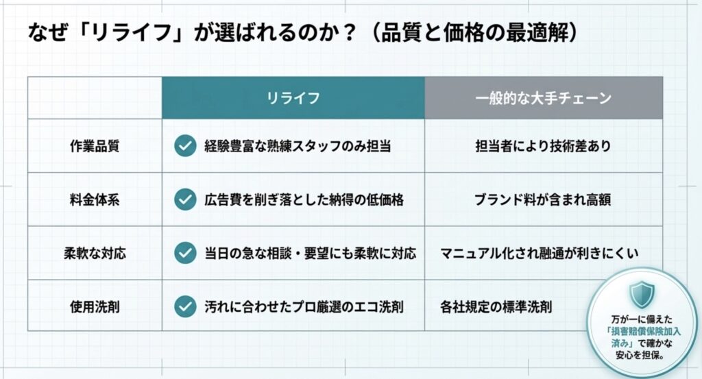 大手の強みである「徹底したマニュアル」と「高品質な仕上がり」を、もっと身近に、もっとリーズナブルにお届けしたい。そんな思いからリライフは始まりました。広告費や無駄な管理コストを徹底的にカットすることで、**「大手と同じ、あるいはそれ以上のクオリティを、個人店に近い低価格で」**実現しています。