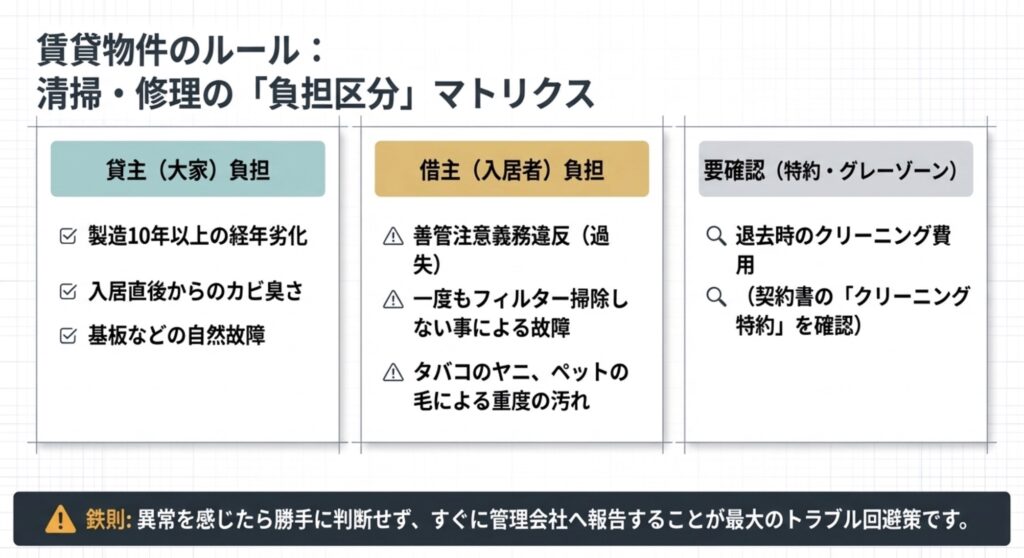 | 貸主(大家)負担 | 製造10年以上の経年劣化、入居直後の臭い、基板の自然故障 | すぐに管理会社へ連絡し、現状を伝える |
